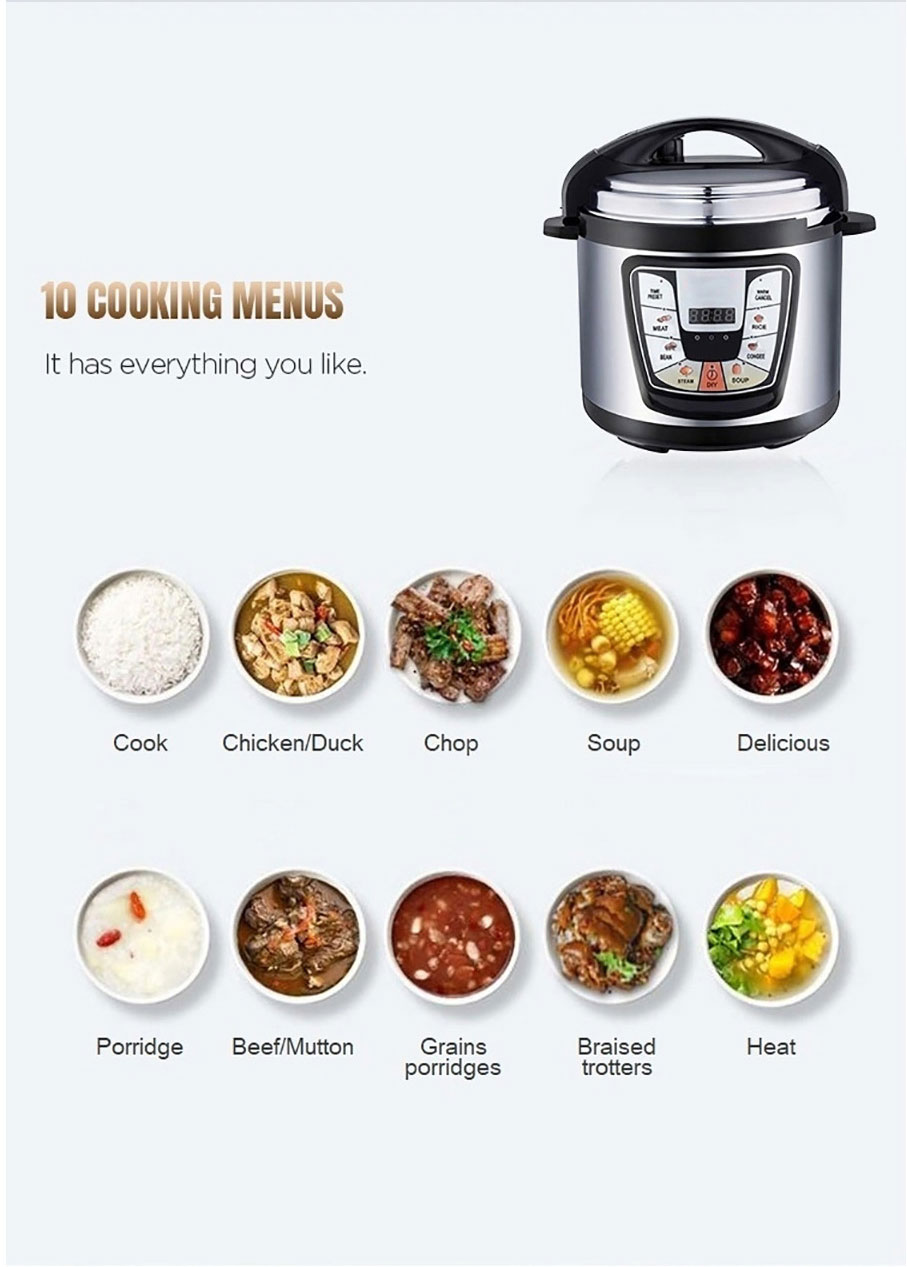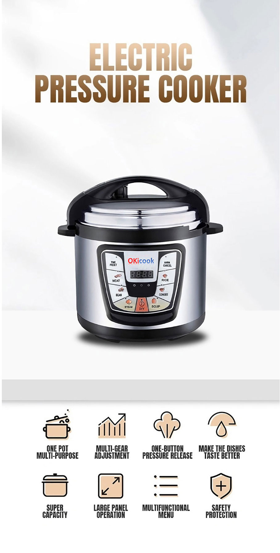 Okicook电压力锅可定制。 当您需要的订单数量达到一定数量时,我们可以根据您的要求定制控制面板。 高压锅内锅可更换201不锈钢、304不锈钢、铝、不粘涂层、陶瓷涂层等。高压锅盖子可以是全塑盖和半不锈钢半塑盖,任意款式 你喜欢的都可以设计。